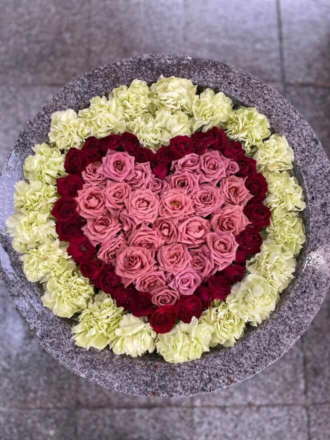 楼門の花手水は優しい色合い、北門の花手水はビタミンカラーとなっており、日頃の疲れを癒やしていただけたらと存じます。駐車場では南宮金山市、斎館では花手水呈茶を行っております。