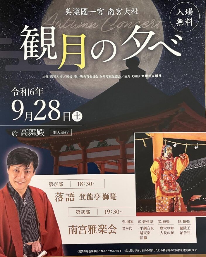来る9月28日(土) 南宮大社高舞殿において「オータムコンサート 観月の夕べ」を開催いたします。