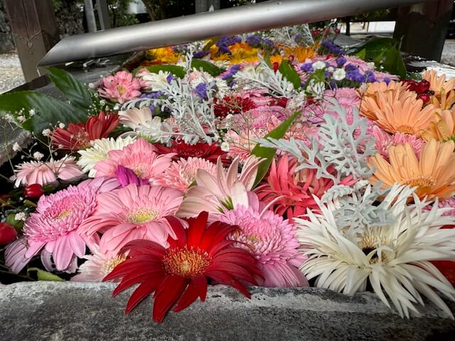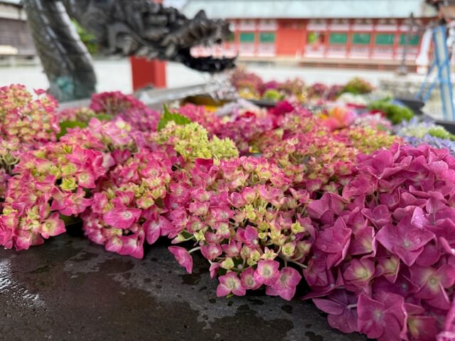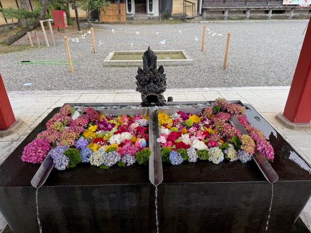 梅雨空を吹き飛ばす鮮やかな花手水となっております。是非、お参りください。