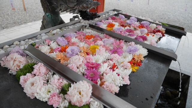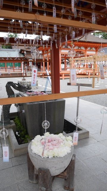 梅雨が明けた爽やかな季節を感じさせる花手水となっております。是非、お参りください。