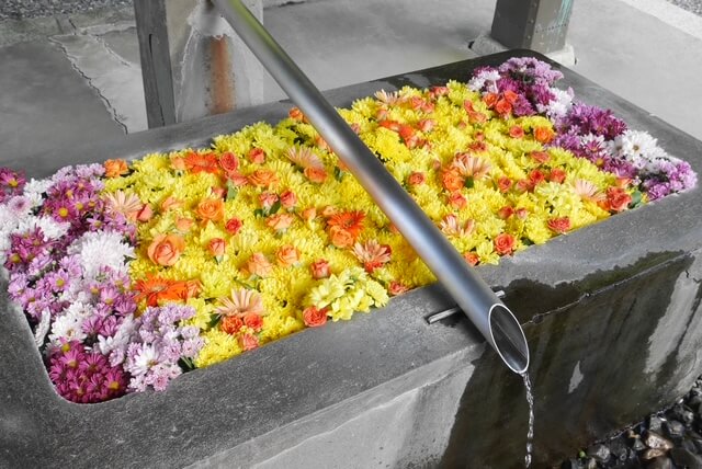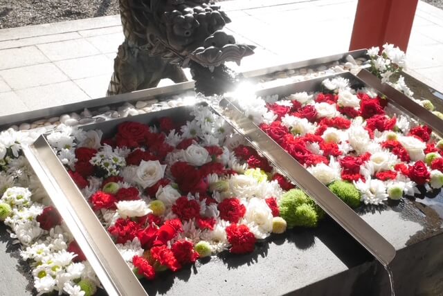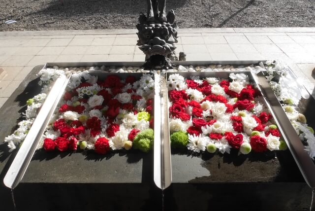 秋らしい涼しげな花手水となっております。是非、お参りください。