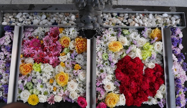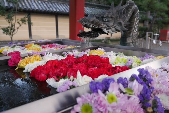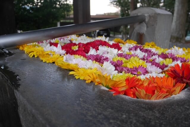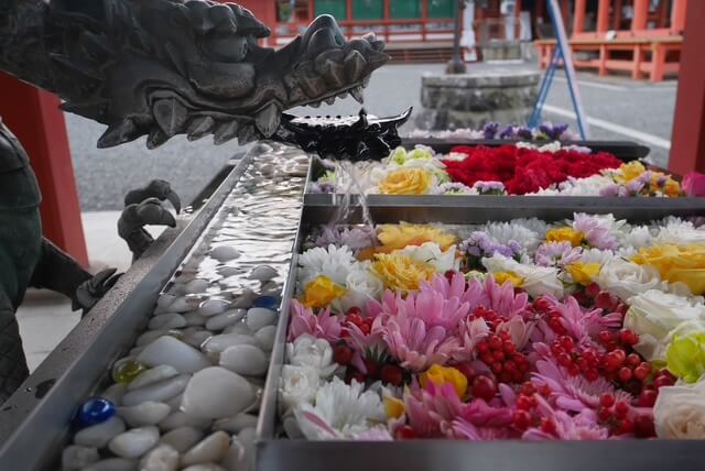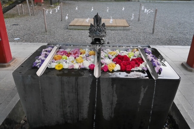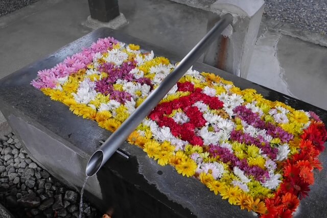 冬の訪れを感じさせる色鮮やかな花手水となっております。