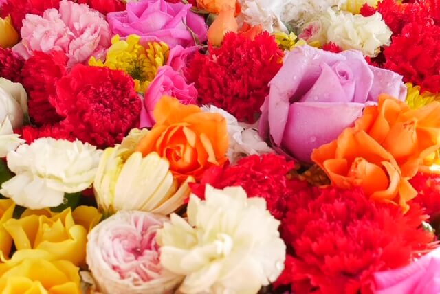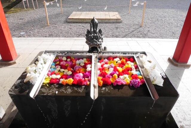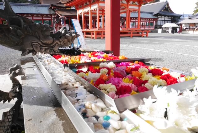 明日、3月15日は月次祭及び花手水の日でございます。暖かな色合いの春を感じさせる花手水となっております。是非、お参りください。
